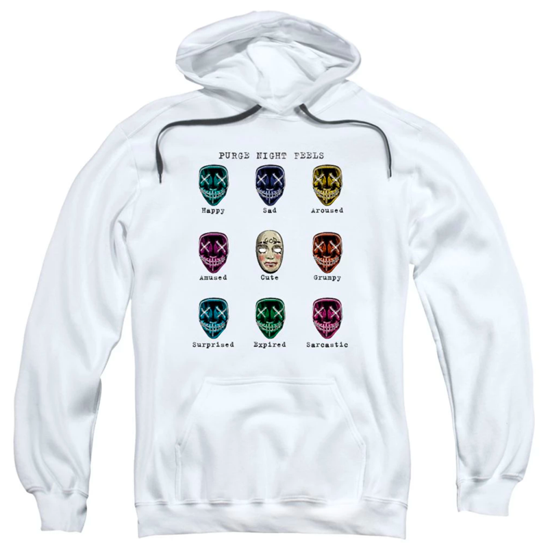 Now, the Canadian-Mexican writer/director, and Latin Horror Ambassadoress, has taken it to the next level with a line of merch created for THE PURGE TV COLLECTION, and also assumes the mantle of designer! Released under the banner of “PURGE NIGHT FEELS,” the line features a short-sleeve t-shirt (in black or white), a long-sleeve hoodie with a comfort pouch (black or white), a handy spiral-bound notebook, and iconic mask. The tee, hoodie and book come emboldened with nine emoji-style icons based on the mask from the Purge franchise that reflect a series of emotions that qualify the theme: happy, sad, aroused, amused, cute, grumpy, surprised, expired, and sarcastic.