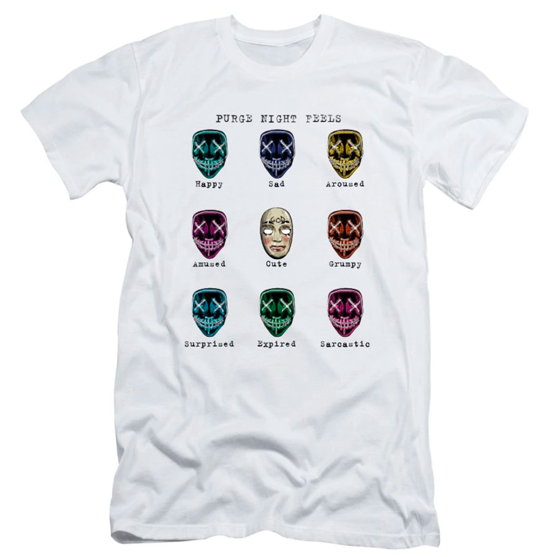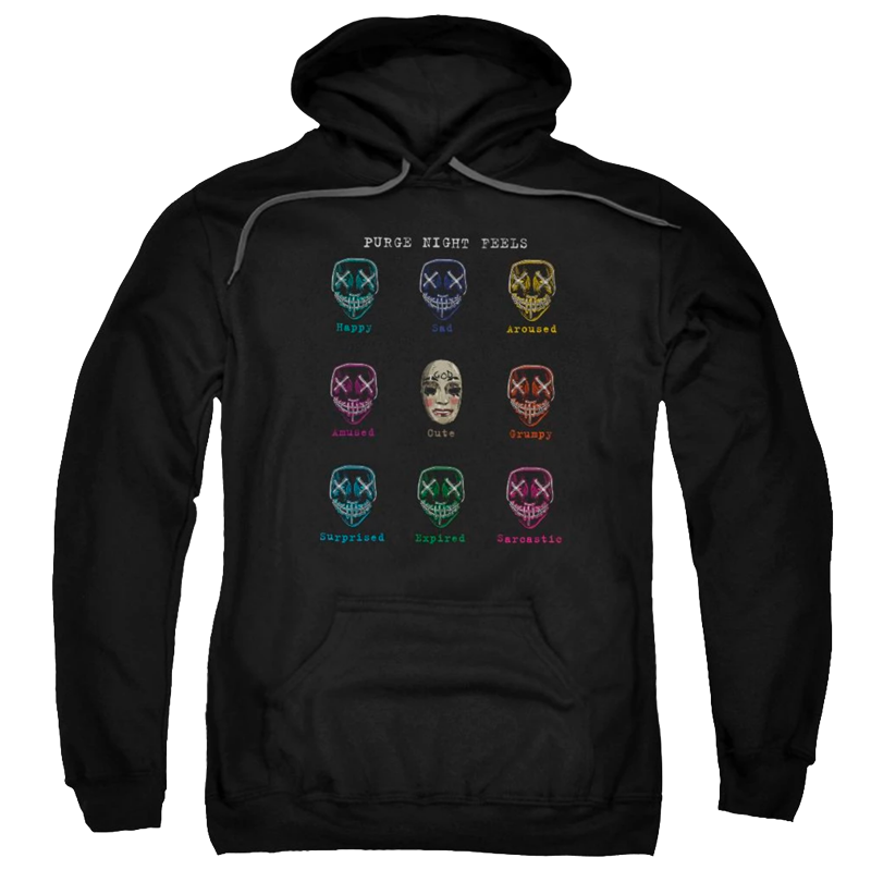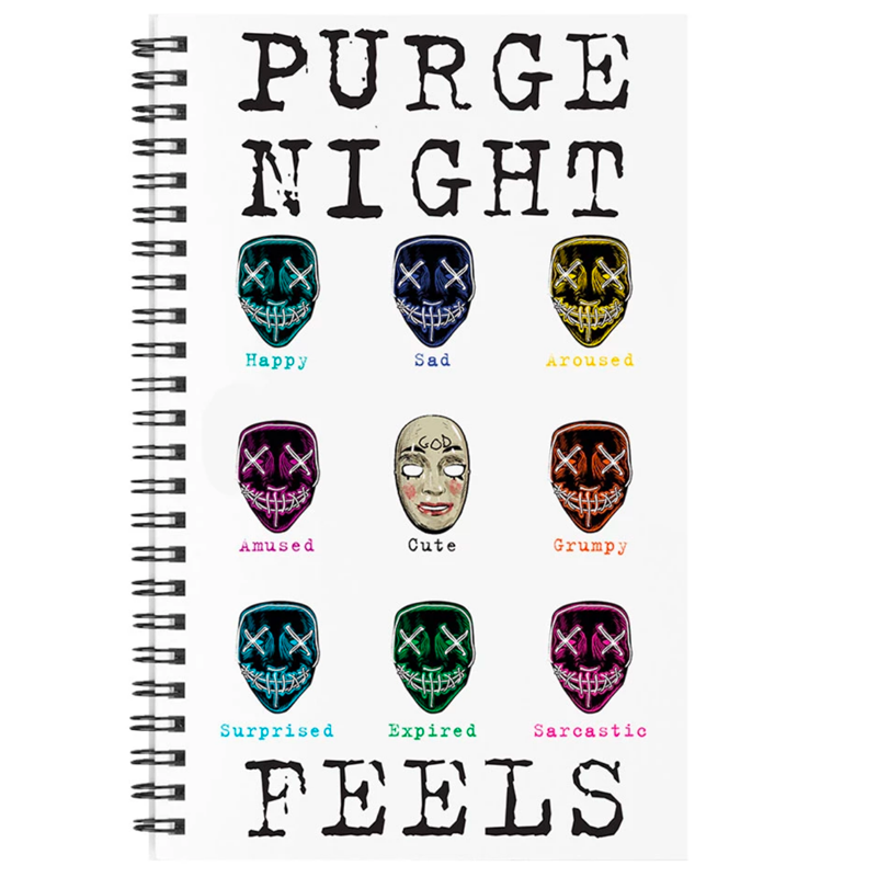 Now, the Canadian-Mexican writer/director, and Latin Horror Ambassadoress, has taken it to the next level with a line of merch created for THE PURGE TV COLLECTION, and also assumes the mantle of designer! Released under the banner of “PURGE NIGHT FEELS,” the line features a short-sleeve t-shirt (in black or white), a long-sleeve hoodie with a comfort pouch (black or white), a handy spiral-bound notebook, and iconic mask. The tee, hoodie and book come emboldened with nine emoji-style icons based on the mask from the Purge franchise that reflect a series of emotions that qualify the theme: happy, sad, aroused, amused, cute, grumpy, surprised, expired, and sarcastic.